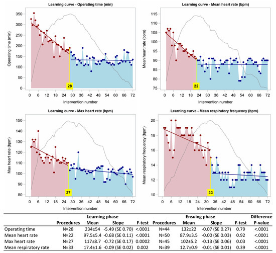 Our analysis of cumulative sum control charts (CUSUM) shows that the inflection point identifying the transition beyond the surgeon learning phase was reached after 28 (operating time), 22 (mean heart rate), 27 (max heart rate) and 33 (mean respiratory rate) cases, respectively.