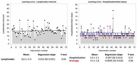Concerning harvested lymph nodes, length of hospitalization and chest tube drainage and postoperative complications, no differences were found during the learning curve or after it (Figure 4).