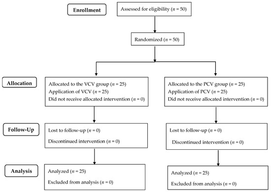 Prior to conducting this prospective study, permission was obtained from the Institutional Review Board of Gachon University Gil Hospital (GFIRB2021-117), and the study was registered with the Clinical Research Information Service of the Korean government (ref. cris.nih.go.kr accessed on 3 May 2021; KCT 0006144). All participants provided written informed consent prior to surgery. This study involved 50 elderly patients aged 65–80 years who were scheduled for elective laparoscopic cholecystectomy and had an American Society of Anesthesiologists (ASA) physical status of 2 (between May 2021 and March 2022). This study excluded patients with a history of active pulmonary disease, uncontrolled cardiovascular morbidity, moderate-to-severe restrictive or obstructive pulmonary disease, and high body mass index (BMI ≥ 30 kg/m2). Patients with subcutaneous emphysema during pneumoperitoneum were excluded from the analysis. Patients were randomly assigned according to whether VCV mode (VCV group, n = 25) or PCV-VG mode (PCV group, n = 25) was applied using Excel 2013 (Microsoft Office, Redmond, WA, USA) without stratification. When the surgery schedule was uploaded, the inclusion and exclusion criteria were checked and the anesthesiologist trainee who did not conducting the study and outcome assess, decided the enrolled participants and informed consent was obtained. Participants, care providers, and outcome assessors were not aware of the assigned group except for the anesthesiologist conducting the study. The anesthesiologist conducting the study received a sealed envelope containing the group assignment according to the list created by the coordinator who did not participate in the research and conducted the research.