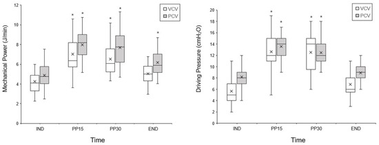 The change in mechanical power (MP) and driving pressure (DP) during the surgery. VCV, volume-controlled ventilation; PCV, pressure-controlled ventilation-volume guarantee; IND, 10 min after anesthesia induction; PP15 and PP30, 15 and 30 min after pneumoperitoneum induction; END, the end of surgery. There was no significant difference in the change over time in the MP (p = 0.911), whereas the change over time in the DP was significantly different between the groups (p = 0.001). Error bars, boxes, middle lines, and x represent the range (minimum-maximum), interquartile range, median, and mean, respectively. * p < 0.05, vs. IND within the group.