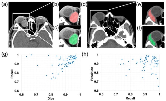 A total of 69 axial CT images were randomly selected as the testing set, and this testing set was used in both segmentation and classification networks. Figure 2 shows the representative segmentation results of the benign and malignant orbital tumors using the proposed DL algorithm. Figure 2a,d show the original non-contrast-enhanced CT images of the patients with cavernous hemangioma and lymphoma, respectively. Comparison of the ground truth [red annotations in Figure 2b,e] and DL algorithm predicted segmentation [green annotations in Figure 2c,f] showed good performance in segmenting orbital tumors of different natures. The DSC quantitively described the overlap of the ground truth and the predicted result. The mean DSC value was 0.89 in the testing set. The recall-to-dice and precision-to-recall scatter diagrams in Figure 2g,h display the detailed segmentation results of all images in the testing set, demonstrating that high precision and recall were achieved in most images.