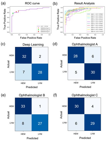 The ROC analysis demonstrates the effectiveness of ResNet-34 in benign and malignant orbital tumor classification, with an AUC of 0.9126. The diagnostic results of three ophthalmologists are also visualized in Figure 3a. Since the dataset used in this study was relatively small and from two individual institutions, 10-fold cross-validation was carried out to verify the stability and robustness of the proposed DL methods. The entire dataset of 602 images was randomly divided into 10 folds. At each passage, nine folds were randomly taken as the training set, and the remaining fold was taken as the testing set. This process was repeated 10 times to make sure each image had been trained and tested. Figure 3b shows that a consistent performance was obtained, with the AUC of the binary classification ranging from 0.8439 to 0.9546. Figure 3c–f show the confusion matrices of the DL-based model and three ophthalmologists, respectively. The number of orbital tumors that were misdiagnosed by the DL algorithm and ophthalmologist B was the same (nine images, 13.04%), which was smaller than the other ophthalmologists. There are 11 (15.94%) and 10 (14.49%) images that were misclassified by ophthalmologists A and C, respectively.