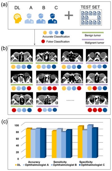 (a) Comparison of classification performance between the DL-based model and 3 ophthalmologists in the test set; (b) representative classification results; (c) comparison of the accuracy, sensitivity, and specificity of DL-based model and 3 ophthalmologists.