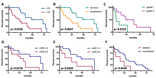 Prognostic factors for survival in anaplastic meningiomas. (A), Age; (B), tumor subtype (de novo vs. progressive); (C), grade of origin (limited to progressive cases); (D), preoperative clinical status; (E), postoperative clinical status; (F), laterality of tumor.
