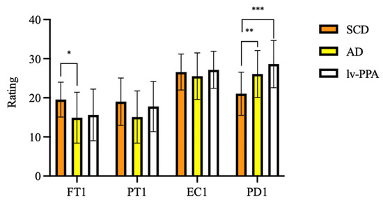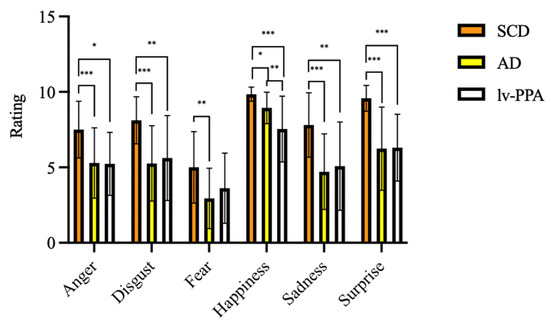 Emotional recognition ability as assessed by Ekman 60 Faces Test in subjective cognitive decline (SCD), Alzheimer’s disease (AD), and logopenic variant primary progressive aphasia (lv-PPA). * p < 0.05, ** p < 0.005, *** p < 0.001.