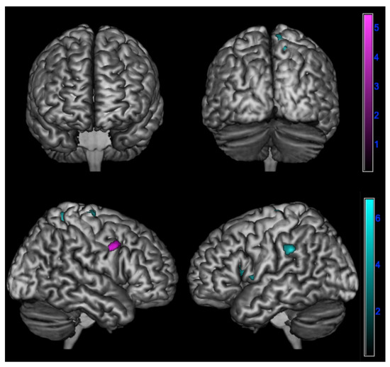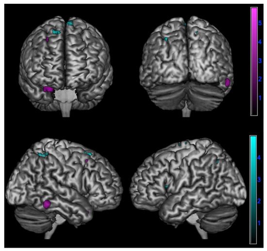 Figure 4. Positive correlation between changes in emotional contagion over time assessed by ∆PD (PD-T0 - PD-T1) and brain metabolism in logopenic primary progressive aphasia and amnesic Alzheimer’s disease patients at 18F-FDG-PET SPM analysis. Significant clusters projected on the standardized Montreal Neurological Institute (MNI) magnetic resonance imaging (MRI) render surface. Color grading: cyan, lv-PPA; violet, amnesic AD.