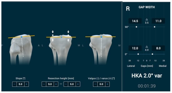 For the tibia implant positioning, one category for slope, another one for varus/valgus cut, and a third one for the resection height were implemented. The reference system is the mechanical axis of the tibia, obtained by palpating the 2 malleoli and the centre of the tibia head (ACL insertion). All decisions could be modified in steps of 0.1 mm or 0.1 degrees, and all were linked to each other and to the gap sizes, according to the typical workflow of navigation or robotic systems. The centre of rotation was placed in the centre of the tibia surface (for both directions, varus/valgus, and anterior–posterior slope). Therefore, an increase in tibia slope simultaneously affected the extension and flexion gap, however, in opposite directions. For the varus/valgus cut, all changes were performed again around this centre point. Hence, every degree of bone cut led to a 0.5-degree change on the medial and opposite on the lateral side. Medial and lateral cartilage loss was quantified in the patient briefing. A size of 2 mm described intact cartilage, and every loss was displayed in 0.5 mm steps. A size of 0 mm meant complete cartilage loss. The same was performed for the distal and posterior femur. Negative values described bone loss. In a separate step, the height of the tibia cut needed to be adapted to the desired height. Both these effects were again linked to extension and flexion gap sizes (Figure 1).