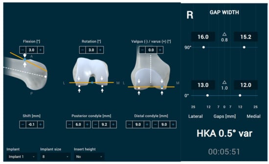 All 125 exercises (TKA surgeries) can be simulated with all alignment philosophies. Additionally, different balancing goals were integrated. Traditionally, the goal of gap balancing was equal gap size for all four gaps [,]. As a second option, a larger flexion gap of 2 mm compared with the extension gap was defined. In this scenario, medial and lateral gaps should be equal, both in extension and flexion. The third balancing goal option integrated into the tool is to leave the lateral flexion gap 2 mm larger than the medial flexion gap. Both extension gaps must equal the medial flexion gap. This represents the balancing goal defined in KA/RKA/FA and PSA. As all cases can be performed with all alignment philosophies and with all balancing goals, a final sample size of approximately 4000 simulation scenarios has been created so far. More cases are being added to the tool in order to include all phenotypes in larger numbers. With this data, future analysis can be performed.
