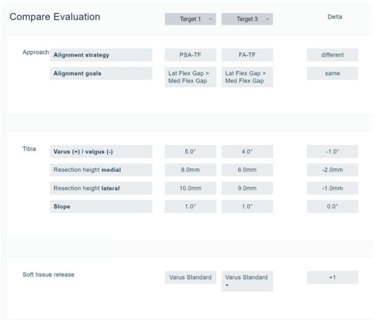 Comparison function. In all cases, all decisions of different alignment philosophies can be seen on one screen (in this figure, only for tibia and soft tissue). This allows a comparison of different philosophies in different cases. Here, the difference between PSA-TF and FA-TF is shown for tibia and soft tissue decisions.