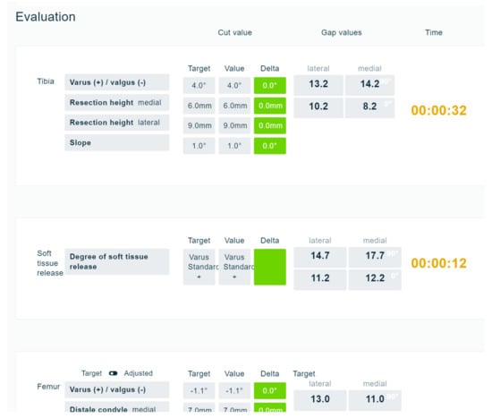 This allows for quantifying each decision and determining the difference between the algorithm value and the value chosen by the trainee. Four categories for final evaluation were implemented: 1—bony cuts; 2—gap balancing; 3—HKA; and 4—time. The overall rating system is visualised in three colours, in a traffic light logic. Green means the decision was correct. The criteria to be rated as correct was defined to be within 1 mm or 1 degree from the algorithm-based decision. Between 1 and 2 mm, the colour of the box became orange, and every deviation larger than 2 mm or 2 degrees was visualised in red. An additional colour of blue was installed. This was displayed if the balancing goal could not be achieved with the defined alignment workflow, even if all bony cuts had been performed perfectly according to the algorithm definitions.