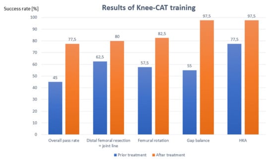 Summary of the results showing the overall improvement after Knee-CAT training. The most common problems were the distal femoral cut, femoral rotation, and gap balancing. Each category was again improved after training, with gap balance and HKA to almost 100%.