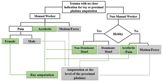 Based on our analyses of patient quality of life, functionality, and postoperative pain, we present a stratified flow chart to enable personalized patient decision-making regarding ray and proximal phalanx level amputations (Figure 2). Indicative factors for ray amputation are shown in green, while gray indicates factors that may lead to a preference for proximal phalanx amputation. Notably, patients concerned with aesthetics, postoperative pain, and hand dominance are shown to prefer the outcomes of ray amputation. In contrast, manual workers and non-manual workers with hobbies such as sports and music, who are concerned about the motion and strength of their affected hands, are more likely to favor amputation at the level of the proximal phalanx.