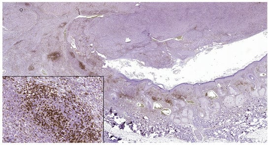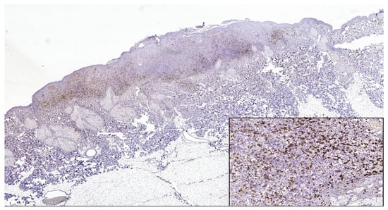 CD8 intense positive reaction in superficial spreading melanoma (CD8 Monoclonal Antibody, clone SP16, scanned image). In the lower right side, detail ob.x200.