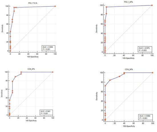 PD-L1, CD4, and CD8 tumor-infiltrating lymphocytes expressions patterns as potential biomarkers in melanoma diagnosis. Receiver operating curve (ROC) analyses were generated from 61 patients and had a value of the area under the curve (AUC) for PD-L1 (TILs: sensitivity: 97.30%, specificity: 91.67%; p < 0.001; M: sensitivity: 96.43%, specificity: 96.97%; p < 0.001), CD8 tumor-infiltrating lymphocytes (M: sensitivity: 89.13%, specificity: 86.67%; p < 0.001), and CD4 tumor-infiltrating lymphocytes (M: sensitivity: 84.31%, specificity: 90.00%; p < 0.001), respectively.