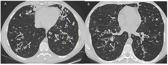 A woman and a man with CF with different and higher anatomo-structural involvement at HRCT in women with CF compared with men. (A) Diffuse cystic-varicoid bronchiectasis, with diffuse wall thickening and mucous plug (white arrow) in a young woman patient with cystic fibrosis. (B) Bronchiectasis with thickened walls (white arrow), especially in the medium-lower pulmonary lobes in a male patient with cystic fibrosis.