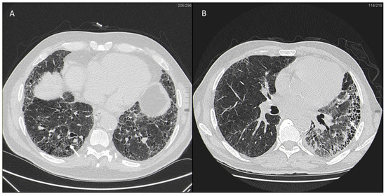 IPF is a chronic, irreversible, disabling disease with a fatal outcome characterized by a progressive decline in lung function. It is associated with a radiological pattern of usual interstitial pneumonia (UIP). In the literature, women have shown less fibrotic alterations than their male counterparts at HRTC (Figure 4).