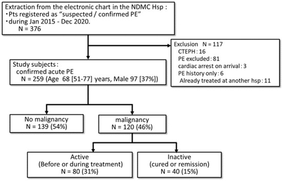 The present study was conducted as a single-center retrospective observational study at the National Defense Medical College (NDMC) Hospital. We collected all cases of suspected or confirmed PE registered in the electric medical chart in NDMC Hospital between January 2015 and December 2020. After reviewing the medical records of these cases, we excluded cases with chronic thromboembolic pulmonary hypertension (CTEPH), those who did not have PE after close examination, those who had a cardiac arrest on arrival, those who had only a history of PE, and those who had been already treated at other hospitals. The cases with a confirmed diagnosis of acute PE were included in the present analysis. The cases were classified into two groups: those with malignancy and those without, based on the chart record. The patients with malignancy were further divided into two groups according to the status of malignancy as follows: the active group for patients with not-cured malignancy before or under treatment, and the inactive group for patients with malignancy already cured or in remission, which is defined as completed treatment with no signs of relapse or metastases. The status of malignancy was determined based on the chart records. The severity of PE was classified into the 3 grades based on the guidelines by [12,13,14] as follows: massive PE with hemodynamic instability, submassive PE with hemodynamically stable right heart strain findings on echocardiography and/or elevated troponin I level, and non-massive PE without them.