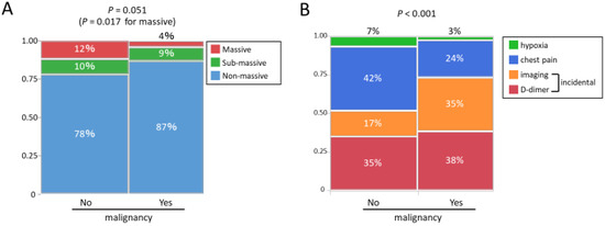 The severity of PE was compared between the malignancy group and the no-malignancy group (Figure 2A). The malignancy group showed a significantly smaller proportion of massive PE (p = 0.017, Figure 2A). The primary trigger leading to PE diagnosis is shown in Figure 2B. In the no-malignancy group, symptoms and signs such as hypoxia or chest pain were the primary trigger in approximately half of the patients, while in the malignancy group, laboratory findings such as D-dimer and image findings such as CT consisted of a higher percentage (73%).