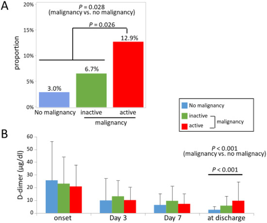 Table 2 shows the medication used as an initial treatment of PE. In most cases, heparin was administered as an initial treatment both in the malignancy group and the no-malignancy group. There was no significant difference between the two groups. Figure 3A shows the proportion of patients who did not show the regression of thrombus in the CT findings during the treatment. The percentage of patients who did not show the regression of thrombus was significantly higher in the malignancy group than in the no-malignancy group (p = 0.028). In the active malignancy group, the percentage of patients who did not show the regression of thrombus was 12.9%, which was significantly higher than the other groups (p = 0.026, Figure 3A). The changes in D-dimer over time are shown in Figure 3B. D-dimer decreased after the initiation of treatment in all groups, but it was less prominent in the malignancy group, resulting in a significantly higher D-dimer value at discharge in the malignancy group (p < 0.001, Figure 3B). In the active malignancy group, the D-dimer value at discharge was significantly higher than in the other groups. In multiple regression analysis, concomitant malignancy or active malignancy was independently associated with a higher D-dimer value at discharge (Table 3) As an anticoagulant medication at discharge, DOAC was more commonly prescribed in the malignancy group (Table 2). The details of DOAC are shown in Supplementary Materials Table S1.