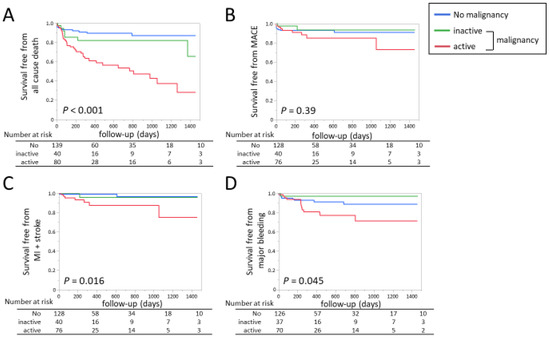 Based on these results, a multivariate Cox proportional hazard model analysis was performed for all-cause death, MACE, the composite of MI and stroke, and major bleeding events within 4 years after discharge (Table 4). Active malignancy was associated with a higher incidence of death, MACE, or the composite of MI and stroke compared to the no-malignancy group. For MACE or MI + stroke, comparison between active and inactive malignancy did not reach statistically significant differences. The incidence of major bleeding was significantly higher in active malignancy compared to inactive or no malignancy.