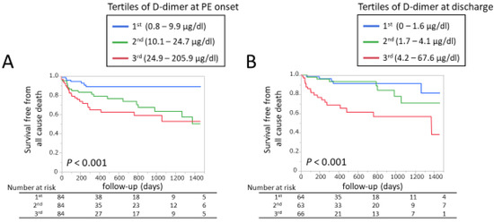 Kaplan–Meier curves for all-cause death in the whole study population divided by (A) tertiles of D-dimer at PE onset and (B) at discharge. PE, pulmonary embolism.