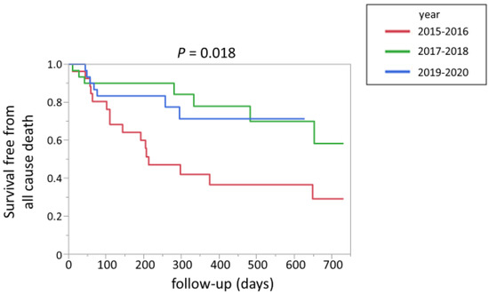 Figure 6 shows the Kaplan–Meier curve for all-cause death in patients with malignancy according to the years of PE diagnosis. Compared to the patients registered between 2015 and 2016, the survival rate was more favorable for patients who were registered in the more recent period (Figure 6).