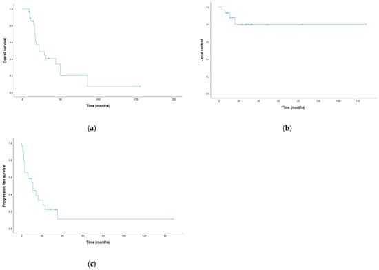 Kaplan–Meier curves for survival analysis: (a) overall survival; (b) local control; (c) progression-free survival.
