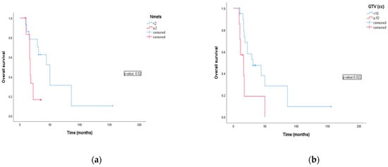 Hasan et al. reported survival outcomes of SBRT for a cohort of 30 patients with recurrent gynecological cancer. The 5-year survival rate was 42% with a median survival period of 43.4 months. The median SBRT dose was 27.5 Gy (range 15–40 Gy) in 3 to 5 fractions. Multivariate analysis showed ECOG performance status (PS) and CTV to be independent prognostic factors for survival outcomes. The CTV was less than 24 cc yielded 2 year survival of 86 vs. 53% for greater than 24 cc (p = 0.005) [26]. In her study, B A. Jereczek-Fossa evaluated SBRT for single abdominal lymph node cancer recurrence in oligometastatic settings. Primary diagnoses included urological, gastrointestinal, gynecologic, and other malignancies. PFS was significantly correlated to the volume of target lesion; increase in GTV of 1 cm3 was correlated with 1% increase of the progression probability. Overall survival rate was significantly related to the primary histology [27]. Additionally, the study of Sato A. et al. analyzing SBRT to only lymph nodes from different primitive origin has showed that OS was significantly lower in a group of patients with a GTV > 20 cm3 compared with patients with smaller target lesion [28]. In our group of patients, GTV was prognostic factor for OS, the 1 and 2 year overall survival for GTV < 10 cc were 95.2% and 52.1%, respectively. Instead, the group for GTV > 10 cc the 1 and 2 year overall survival were 57.1% and 19.2% (p-value 0.022). GTV diameter was also an unfavorable risk factor for OS and DMFS.