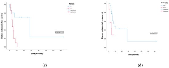 The number of lymph nodes metastasis was a prognostic factor. One and two years OS were 86.2% and 78.3% for patients with <2 lymph nodes metastases compared to 83.3% and 33.3% for patients with >2 (HR: 3.32 CI 95%:1–10; p-value 0.022). Six month and one year DMFS were 80% and 70% vs. 78.6% and 38.6% for patients with <2 lymph nodes metastases and patients with >2. (HR: 5.57 CI 95%: 1.7–18; p-value 0.001). Lymph node metastases smaller then 10cc (GTV < 10 cc) and with diameter < 20 mm were significantly related with favorable outcomes of OS (p-value 0.022 and 0.024) and DMFS (p-value 0.037 and 0.045) compared to metastases >10 cc or with diameter >20 mm (Figure 2).