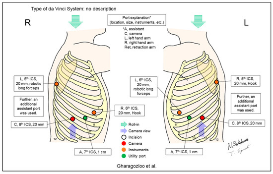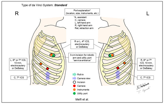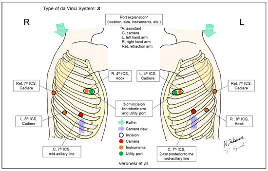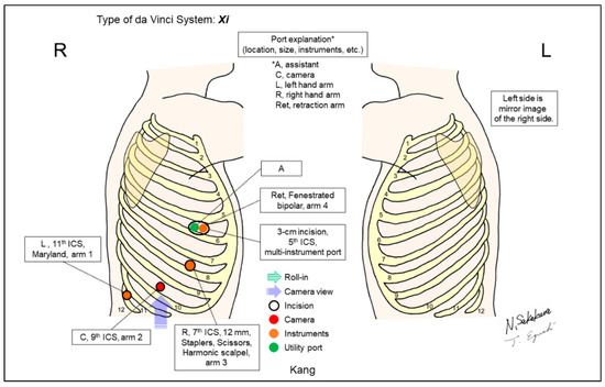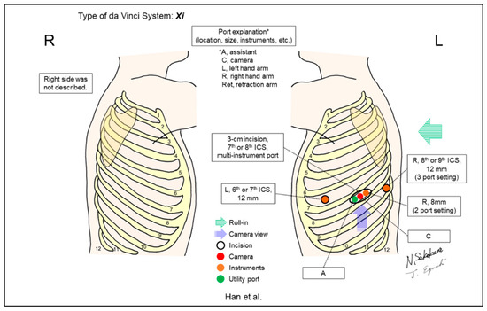 - Sakakura, N.; Nakada, T.; Shirai, S.; Takahara, H.; Nakanishi, K.; Matsui, T.; Ueno, H.; Takahashi, Y.; Kuroda, H. Robotic open-thoracotomy-view approach using vertical port placement and confronting monitor setting. Interact. Cardiovasc. Thorac. Surg. 2021, 33, 60–67. [Google Scholar] [CrossRef]