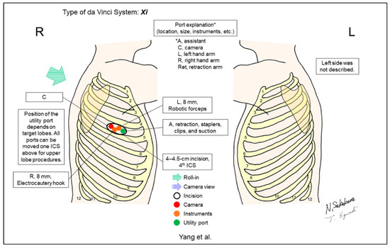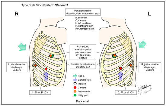 | Park/2006 [3] | Standard c | Look-up | 3 | 3 | 30-degree, down/up | 7–8th | Superior pulmonary vein level or one ICS lower | No | 34 | The incisions used for authors’ thoracoscopic lobectomy were applied. A utility incision is placed at the level of the superior pulmonary vein or one ICS lower, which is shared for an assistant and a robotic arm. |