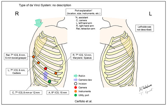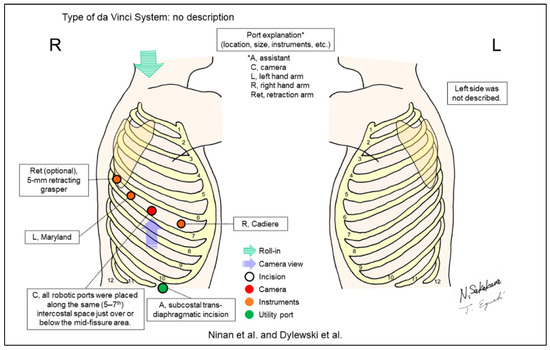 | Funai/2020 [14] | Xi | Horizontal | 5 | 4 | ND | 5th | 10th | Yes | ND | A four-arm, horizontal-view approach, the “Hamamatsu method.” A change of port distribution from the conventional Cerfolio’s CPRL-4 technique was shown on the right-side surgery. |