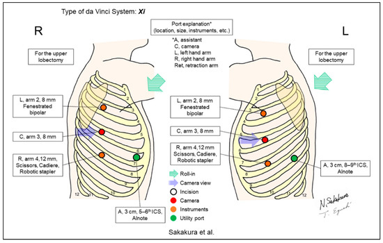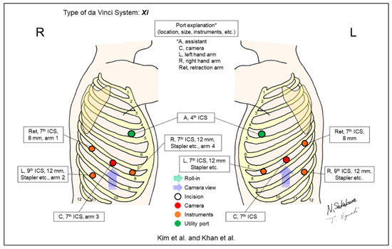 - Kim, M.P.; Chan, E.Y. “Five on a dice” port placement for robot-assisted thoracoscopic right upper lobectomy using robotic stapler. J. Thorac. Dis. 2017, 9, 5355–5362. [Google Scholar] [CrossRef]