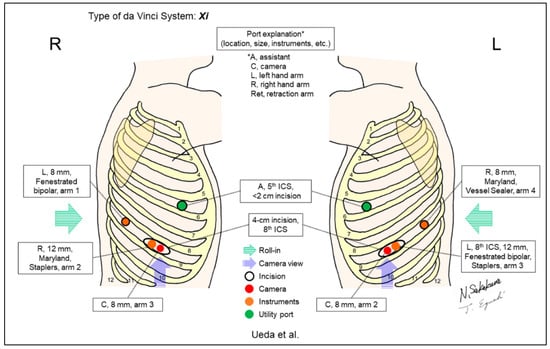 - Ueda, K.; Umehara, T.; Maeda, K.; Suzuki, S.; Yokomakura, N.; Kariatsumari, K.; Sato, M. Three-incision robotic major lung resection for cancer. Transl. Cancer Res. 2021, 10, 4617–4623. [Google Scholar] [CrossRef]