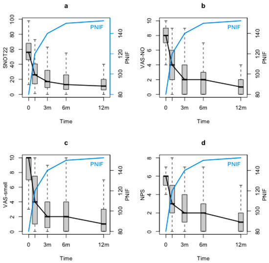 Mixed effect models were fitted to data to take into account their longitudinal characteristic. Following previous work [12], we reduced the heterogeneity in variability of PNIF by taking the transformation MODPNIF = (PNIF)1/2. Given the nonlinearity of all the effects in time, a parameter for each time contrast was included in the model and all significances of the effects of time and all the other variables were obtained by ANOVA tables with F-tests and p-values obtained using Satterthwaite’s method [22] for denominator degrees-of-freedom and F-statistic. The best multiple predictive models for SNOT-22 and NPS were selected via backward stepwise selection based on the Akaike information criterion (AIC) [23]. AIC was also used for comparing the different models. A better model is characterised by a lower AIC value.