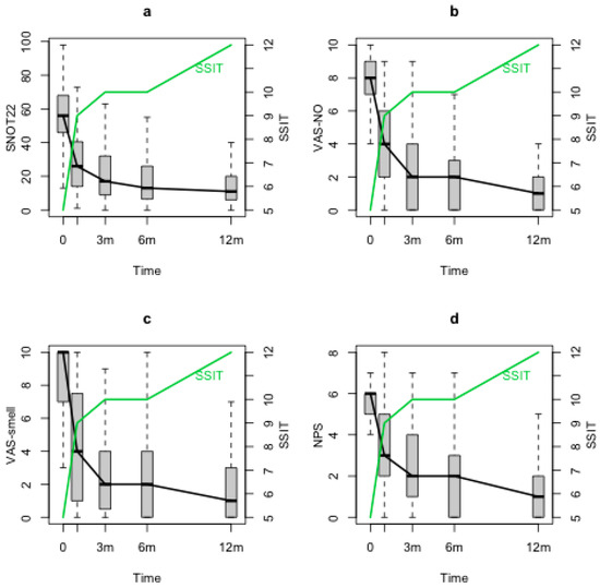 SSIT improved significantly after the baseline (T0) and maintained its improvement through the 12 months follow-up (T1, T2, T3, T4) (p < 0.0001). At T0, a correlation was observed between SSIT and VAS-smell (p < 0.001), VAS-NO (p = 0.02) and NPS (p = 0.012), but no correlations were observed with SNOT-22. When evaluating SSIT changes during the follow-up through the statistical model, negative significant correlations between SSIT and both nasal symptoms and NPS were found (SSIT and SNOT-22 (p = 0.0002), Figure 2a; SSIT and VAS-smell (p < 0.0001), Figure 2b; SSIT and VAS-NO (p < 0.0001), Figure 2c; SSIT and NPS (p = 0.03), Figure 2d).
