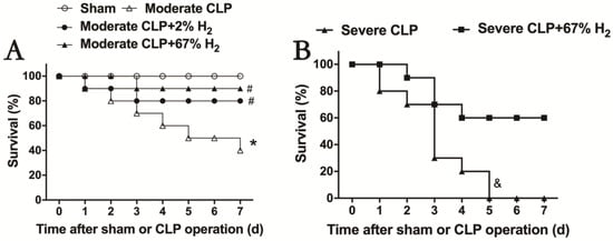 Hydrogen inhalation improved the survival rate of sepsis mice. (A) 2% and 67% hydrogen inhalation could significantly improve the 7-day survival rate of sepsis mice. (B) 67% hydrogen inhalation improved the survival rate of severe sepsis mice. * p < 0.05 vs. Sham group. # p < 0.05 vs. moderate CLP group. & p < 0.05 vs. Severe CLP group.