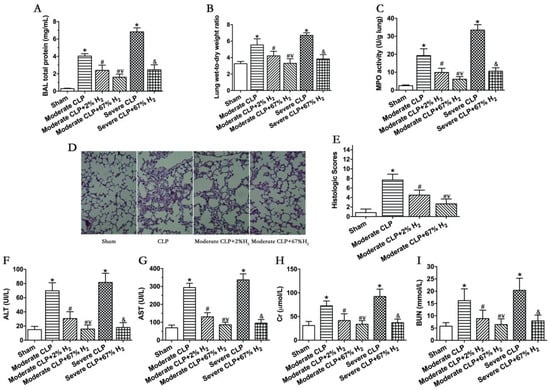 A total of 67% and 2% H2 inhalation attenuated organ injury in septic mice model. Data were monitored and recorded at 24 h after CLP or sham operation. (A) Lung BAL total protein; (B) Lung wet-to-dry weight ratio; (C) Lung MPO activity; (D) HE staining of lungs (400×); (E) Lung histologic scores; Liver injury was represented by (F) ALT and (G) AST; Kidney injury was indicated by (H) Cr and (I) BUN. Values are expressed as means ± SEM (n = 6 per group). * p < 0.05 vs. Sham group. # p < 0.05 vs. Moderate CLP group. ¥ p < 0.05 vs. Moderate CLP + 2% H2 group. & p < 0.05 vs. Severe CLP group.