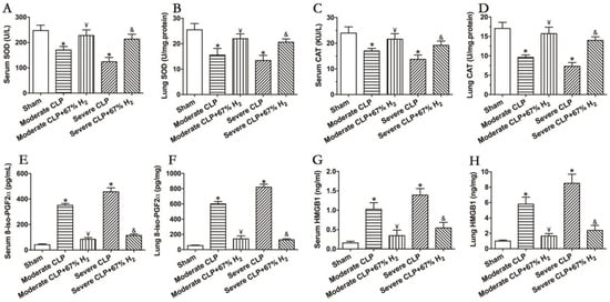 The activities of antioxidant enzymes SOD and CAT can reflect the antioxidant stress response in vivo. The results demonstrated that the activities of the two antioxidant enzymes decreased significantly after the CLP surgery (p < 0.05, Moderate CLP vs. Sham; p < 0.05, Severe CLP vs. Sham), and 67% hydrogen absorption can significantly improve the activities of CAT and SOD in moderate and severe septic mice (p < 0.05, Moderate CLP + 67% H2 vs. Moderate CLP; p < 0.05, Severe CLP + 67% H2 vs. Severe CLP) (Figure 3A,B). Meanwhile, 8-iso-PGF2α was detected to demonstrate the oxidative metabolic response. The content of oxidation product 8-iso-PGF2α in the serum and lungs of animals with moderate and severe sepsis increased significantly, and there was a significant difference compared with the Sham group (p < 0.05, Moderate CLP vs. Sham; p < 0.05, Severe CLP vs. Sham), while 67% of the hydrogen inhalation treatment could significantly reduce the content of the oxidation product 8-iso-PGF2α (p < 0.05, Moderate CLP + 67% H2 vs. Moderate CLP; p < 0.05, Severe CLP + 67% H2 vs. Severe CLP) (Figure 3C). It is well known that the proinflammatory cytokine HMGB1 plays an important role in the pathogenesis of sepsis. We detected it and found that the expression of HMGB1 in lungs and serum of mice with moderate and severe sepsis increased significantly (p < 0.05, Moderate CLP vs. Sham; p < 0.05, Severe CLP vs. Sham), while 67% of the hydrogen inhalation treatment can significantly reduce the content of HMGB1 of septic mice (p < 0.05, Moderate CLP + 67% H2 vs. Moderate CLP; p < 0.05, Severe CLP + 67% H2 vs. Severe CLP) (Figure 3D). The above results demonstrate that 67% hydrogen can reverse the imbalance between inflammation and oxidative stress.
