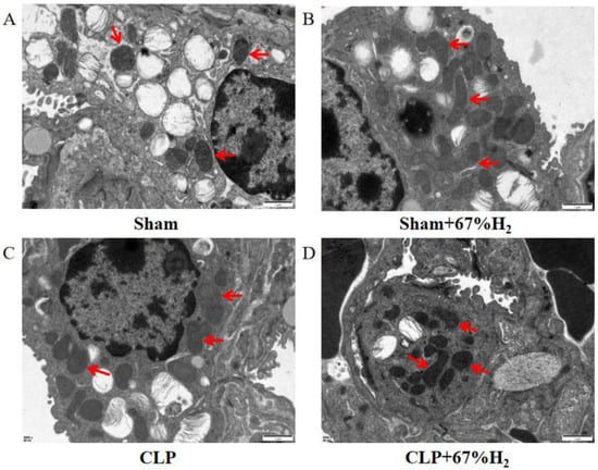 A total of 67% H2 inhalation reduced the degree of mitochondrial damage. As shown by the red arrows, (A,B) Mitochondrial ridges were intact without swelling. (C) Mitochondria became vacuolated and no mitochondrial ridges were observed. (D) Part of the mitochondrial ridges disappeared and the mitochondria were slightly swollen.