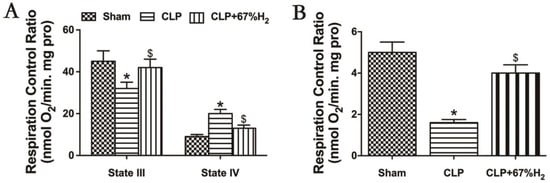 Hydrogen treatment could maintain mitochondrial structural integrity. State III: oxygen consumption rate under ADP presence. State IV respiration rate: the oxygen consumption rate with ADP exhausted. RCR is the value of state III/state IV. (A) State III and IV respiration rate; (B) RCR. Values are expressed as mean ± SD (n = 6). * p < 0.05 versus the Sham group. $ p < 0.05 versus CLP group.