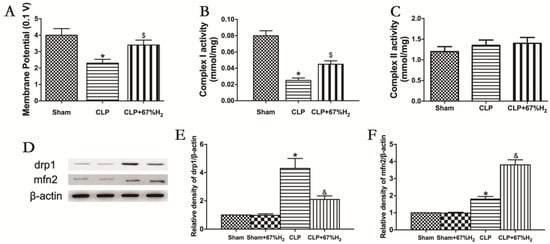 H2 ameliorated sepsis-induced mitochondrial dysfunction. (A) MMP; (B) Complex I activity; (C) Complex II activity; (D) The expression of Drp1 and Mfn2 was detected by Western blot analysis; quantitative analysis of (E) Drp1 and (F) Mfn2 are presented as the ratio of band density to that of β-actin. Data were output as mean ± SD (n = 6). * p < 0.05 vs. Sham group. $ p < 0.05 vs. CLP group. & p < 0.05 vs. CLP group.