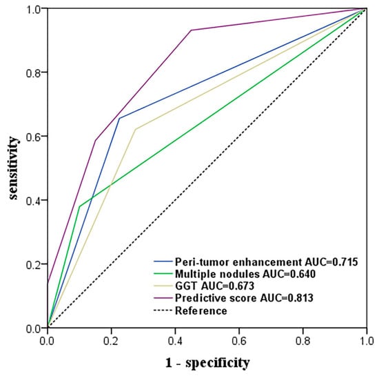 Receiver operating characteristic curves of each independent factor and the prediction score for the prediction of MVI. For the prediction of MVI, the AUC of the prediction score was higher than that of the presence of peri-tumor enhancement (p = 0.053), GGT (p = 0.004) and multiple nodules (p < 0.001).
