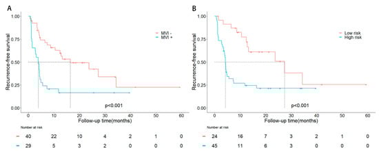 After surgical resection, the median RFS for patients with MVI was 3.9 months, compared with 16.4 months for patients without MVI. Kaplan–Meier survival curves were plotted as shown in Figure 3A, and a significant difference was found in RFS between MVI-positive and MVI-negative patients (p < 0.001). In high-risk patients with a higher prediction score, the median RFS was 4.2 months, while low-risk patients had a median RFS of 27.4 months. Significantly better RFS was observed in patients with lower risk (p < 0.001; Figure 3B).