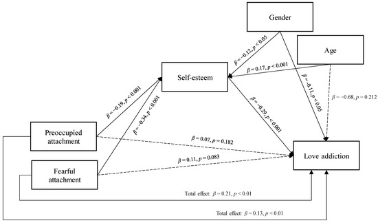 The mediation of self-esteem in the relationship between preoccupied and fearful adult attachment and love addiction, controlling for the effects of gender and age—a path analysis model. Note—dashed lines indicate the non-significant direct effects.