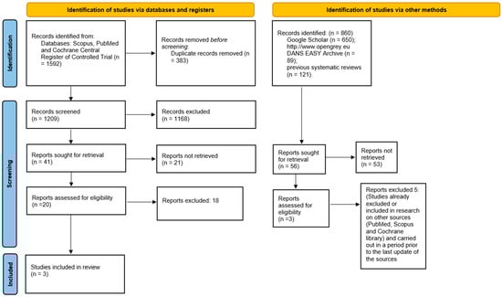 The search in the Scopus, PubMed databases and in the Cochrane Central Register of Controlled Trial resulted in 1592 bibliographic sources; by duplicate removal, 1209 were obtained. The articles that were potentially eligible numbered 20, of which only three fully complied with the inclusion and exclusion criteria and the related extracted data were included in the meta-analysis. Furthermore, the analysis of the gray literature (Google Scholar, Open Gray) and previous systematic reviews did not allow for the identification of further studies to be included in the meta-analysis (Figure 1). The entire procedure of identification, selection, and inclusion of the studies is indicated in the flowchart of Figure 1.