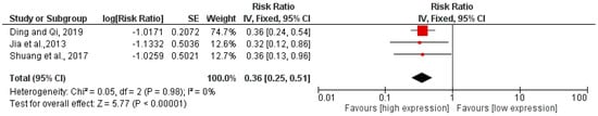 All three studies reported similar RR values between high and low expression between 0.32 and 0.36.