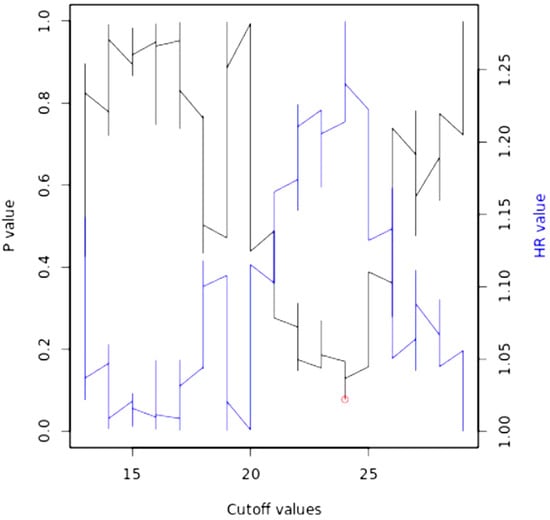 Bioinformatics analyses were performed on the cohort of 512 HNSCC patients (TGCA) through the Kaplan–Meier Plotter database portal (https://kmplot.com/analysis/, accessed on 20 December 2022), generating the following Kaplan–Meier curve (Figure 5), between high and low miR-195 expression. A follow-up period of 60 months was set as a parameter and the cut-off was self-calculated by the portal as at 24 (fold change) (Figure 6); all the cut-off values in relation to the p-values are available in the Supplemental Materials.