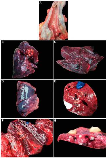 Macroscopic aspects of lung infected with B.1.617.2 SARS-CoV-2 Delta variant: (A) acute pulmonary edema; foamy liquid in trachea; (B–F) condensed, violaceous lung; (G) expression of the pulmonary section in bronchopneumonia.