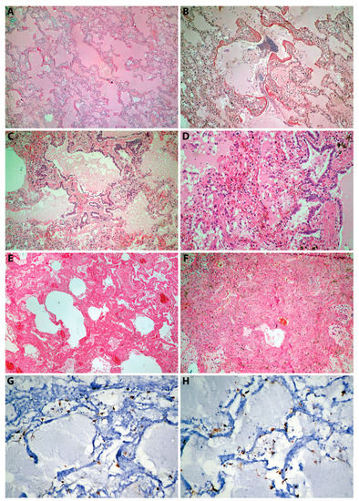 - Konopka, K.E.; Nguyen, T.; Jentzen, J.M.; Rayes, O.; Schmidt, C.J.; Wilson, A.M.; Farver, C.F.; Myers, J.L. Diffuse alveolar damage (DAD) resulting from coronavirus disease 2019 Infection is Morphologically Indistinguishable from Other Causes of DAD. Histopathology 2020, 77, 570–578. [Google Scholar] [CrossRef]